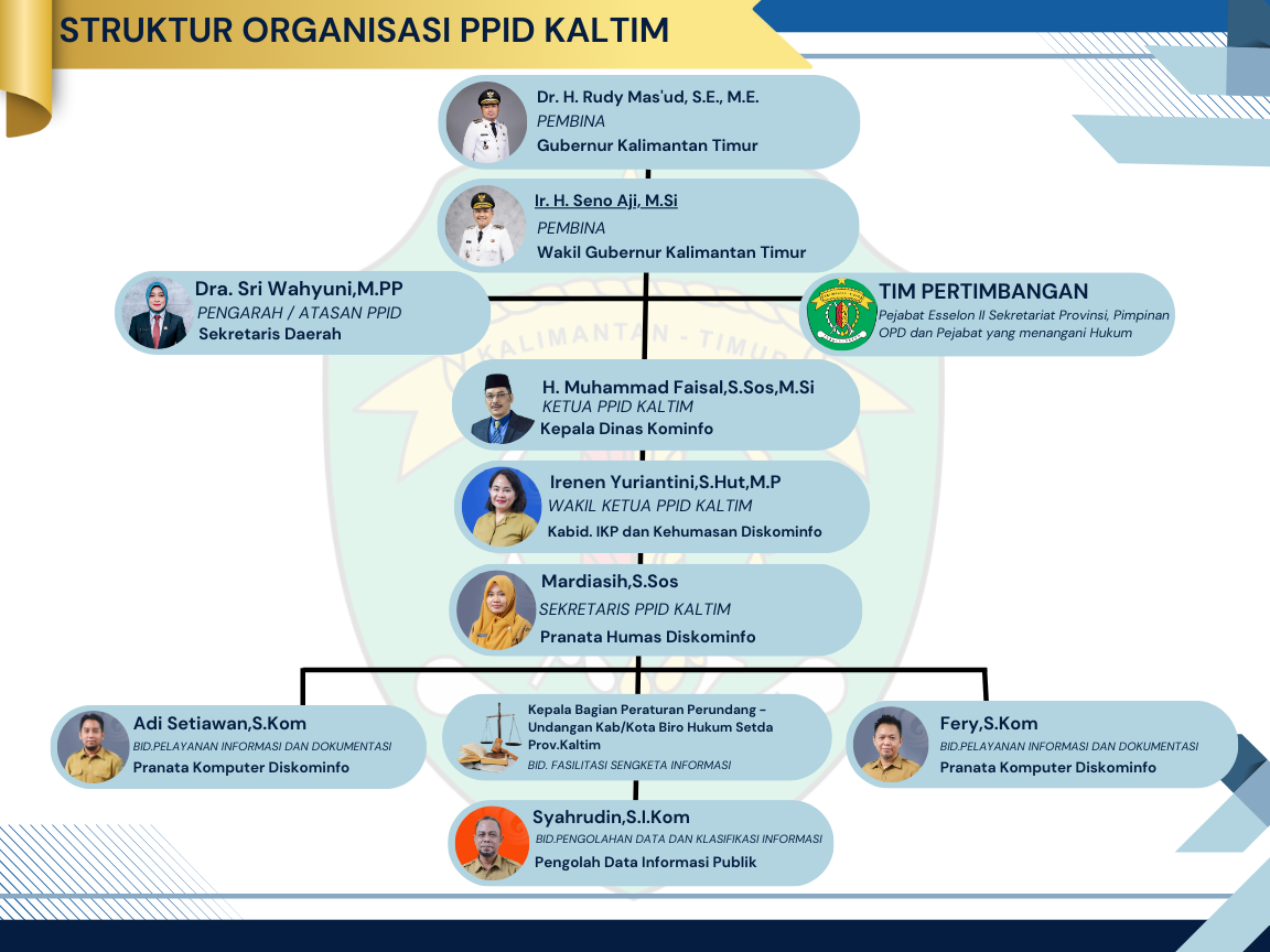 PLID di Lingkungan Pemerintah Provinsi Kalimantan Timur terdiri atas Gubernur sebagai Pembina, Sekretaris Daerah sebagai Atasan PPID dan PPID Kalimantan Timur serta Tim Pertimbangan dimana anggotanya merupakan Pejabat Eselon II dilingkup Pemerintah Provinsi Kalimantan Timur. PPID Kalimantan Timur diketuai oleh Kepala Dinas Komunikasi dan Informatika Provinsi Kalimantan Timur. Sedangkan untuk PPID pelaksana Pemerintah Provinsi Kalimantan Timur ditetapkan melalui Surat Keputusan Kepala Badan/Dinas (OPD) di lingkungan Pemprov Kaltim.